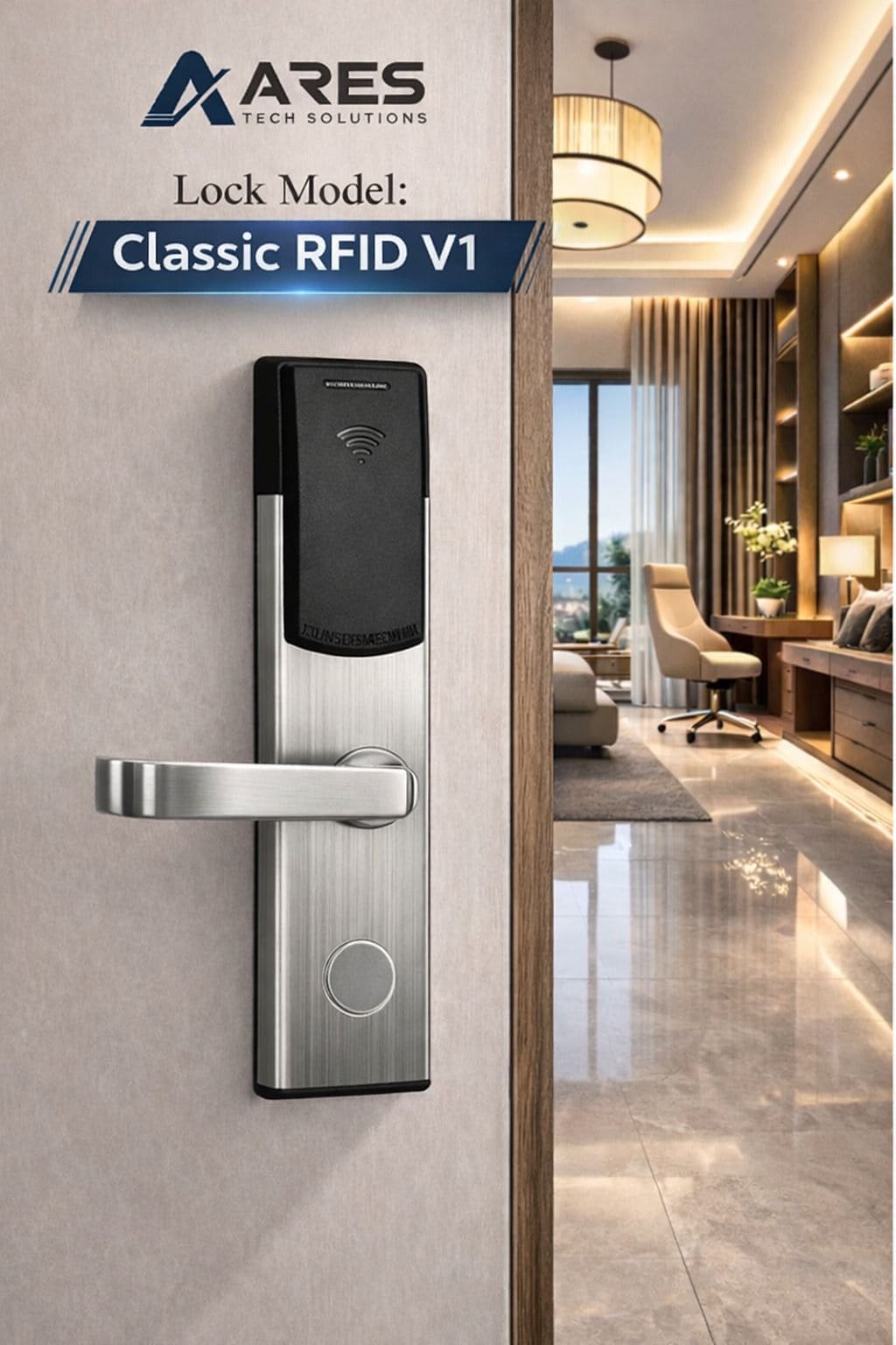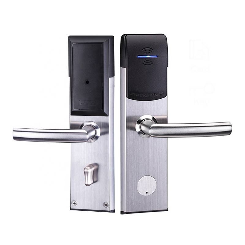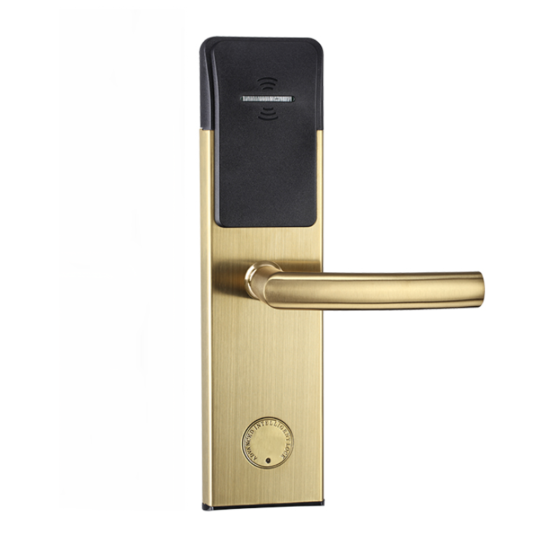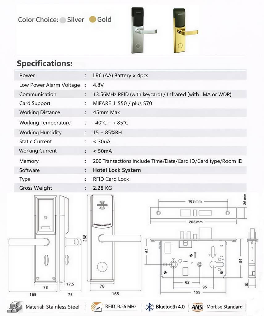 Les cartes RFID permettent une gestion d’accès personnalisée et sécurisée, ainsi qu’une longue durée de vie de la batterie. Disponible en finition Argent ou Or, son design moderne s’intègre parfaitement dans les chambres d’hôtel haut de gamme