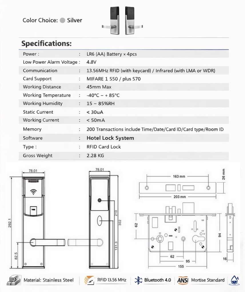 Les cartes RFID permettent une gestion d’accès personnalisée et sécurisée, ainsi qu’une longue durée de vie de la batterie. Disponible en finition Argent ou Or, son design moderne s’intègre parfaitement dans les chambres d’hôtel haut de gamme