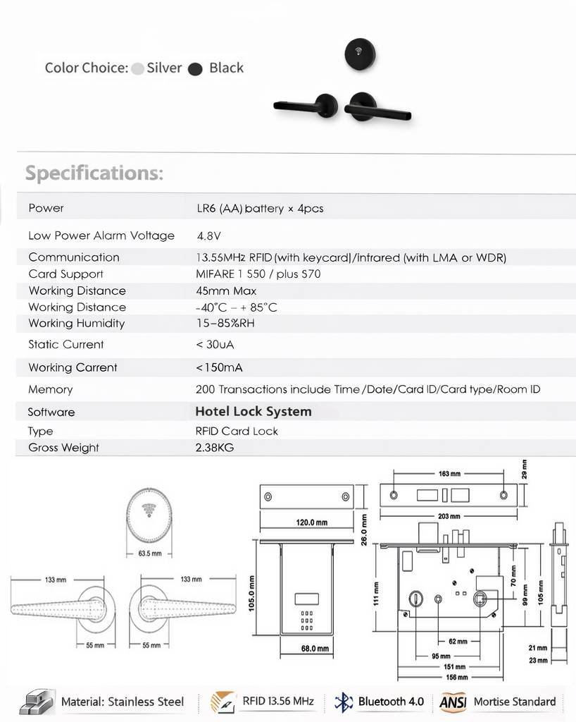 La SIGNATURE S2 RFID combine sécurité moderne et design minimaliste, idéale pour les hôtels ,Elle est dotée d’un lecteur RFID  au panneau noir élégant, encadré par une finition métallique raffinée, installé au-dessus d’une poignée en acier inoxydable brossé. Disponible en finition Argent ou Noir,